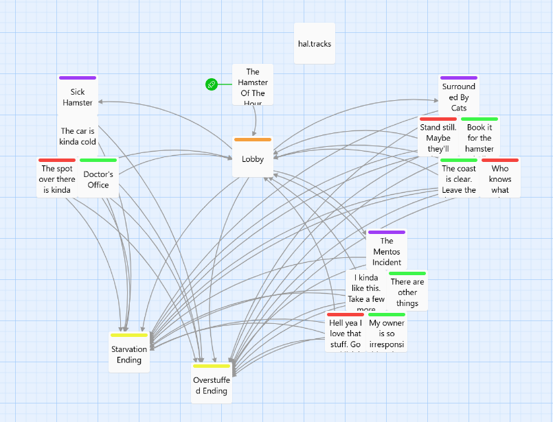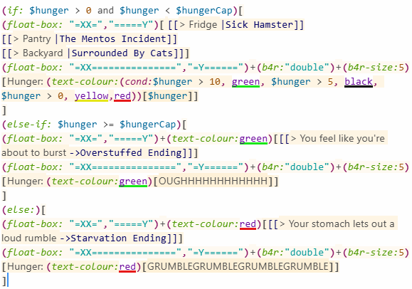 Armed with my blank white background, comic sans font and double lined textboxes, I moved onto the game mechanics. This came in the form of a hunger bar. In order to implement this, I simply made a variable in named $hunger in every passage that would keep track of your hamster's hunger. However, I would also need to keep track of the win and lose conditions for the hamster. To do this, I made special links that only showed up if your hamster's hunger went below zero or hit a certain hunger cap (which was tracked by another variable). Once this happened, I would pause the background music with a special command from Hal and play a Victory Soundtrack.